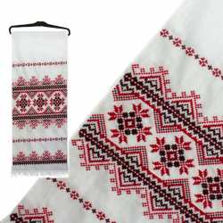 Рушник червоний має геометричні візерунки, які асоціюються з родючістю, заплідненням і засіяним полем. Вишивка характерна для Західної України. Майстрині вишивають руками, заряджають позитивною енергією свої твори. Тип вишивання - хрестиком.